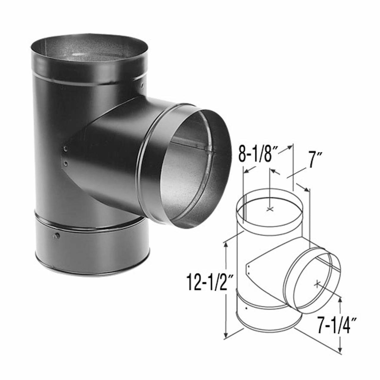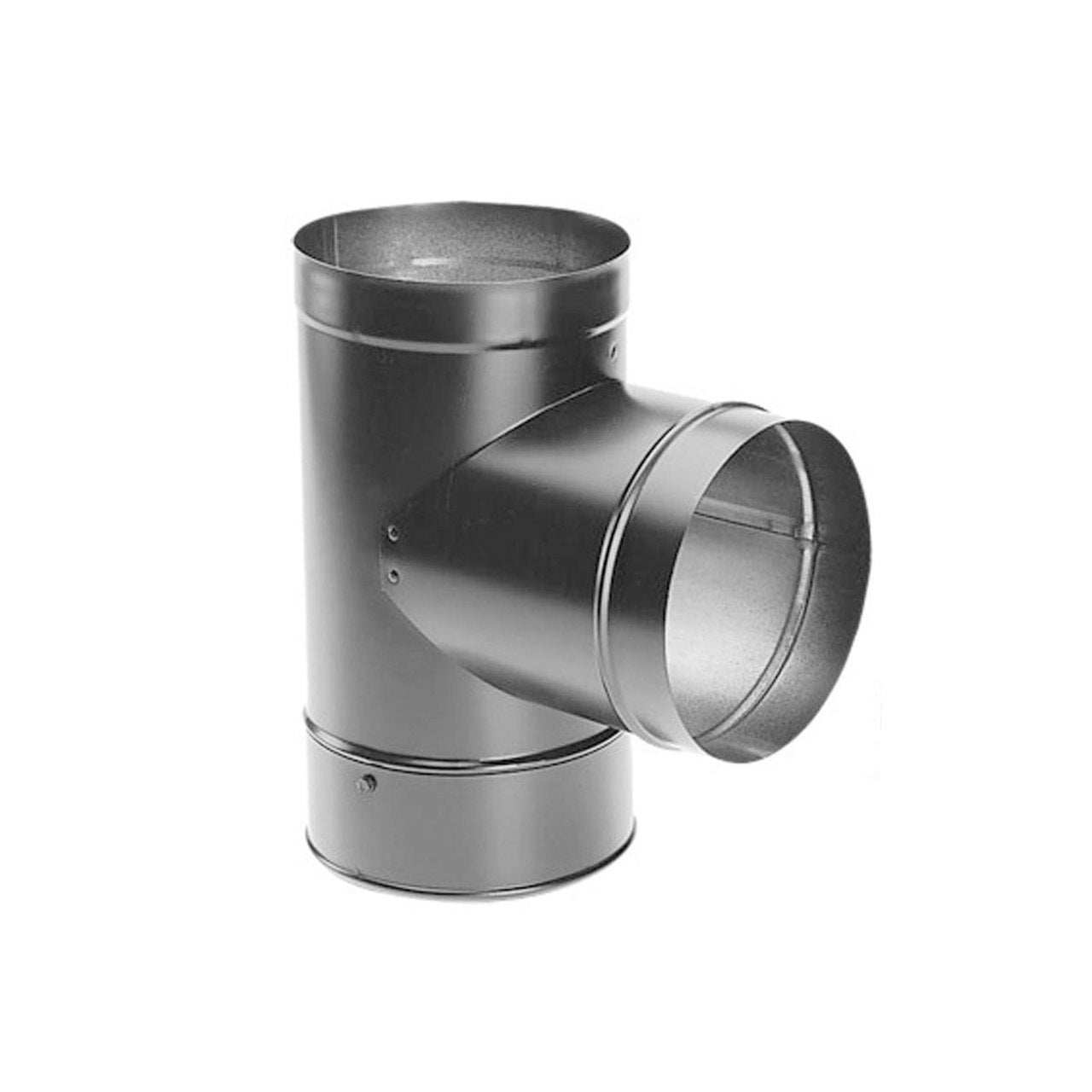 The DuraVent DuraBlack 8" Tee with Clean-Out Cap is built from durable 24-gauge steel and designed for use with rear-exit appliances or those requiring a barometric damper. Its die-formed end fittings and strong spot-welded seams ensure a secure, drip-free connection, while the removable clean-out cap provides easy access for inspection and maintenance. This component is ideal for single-wall interior stovepipe installations, offering long-lasting reliability and simple assembly.