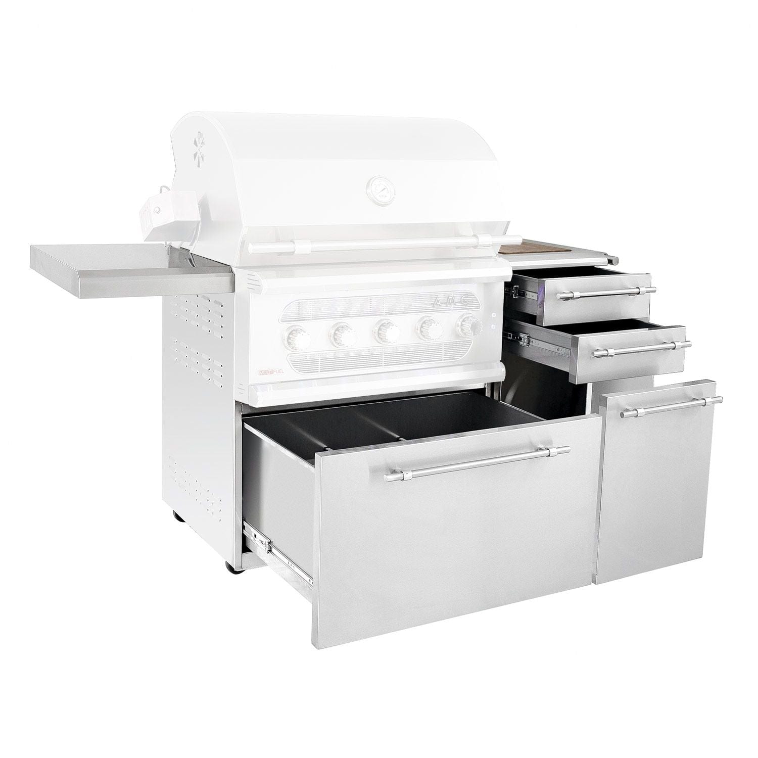 A durable and functional grill base designed for the 36-inch Encore and Muscle Series grills. Built from high-quality 304 stainless steel, this freestanding cart features two adjustable side shelves for added prep space and convenience. The cabinet offers integrated LP tank storage along with a versatile double drawer and single door setup, complete with an in-door condiment tray for easy access to essentials. Heavy-duty locking casters ensure smooth mobility and secure placement on your patio or deck.