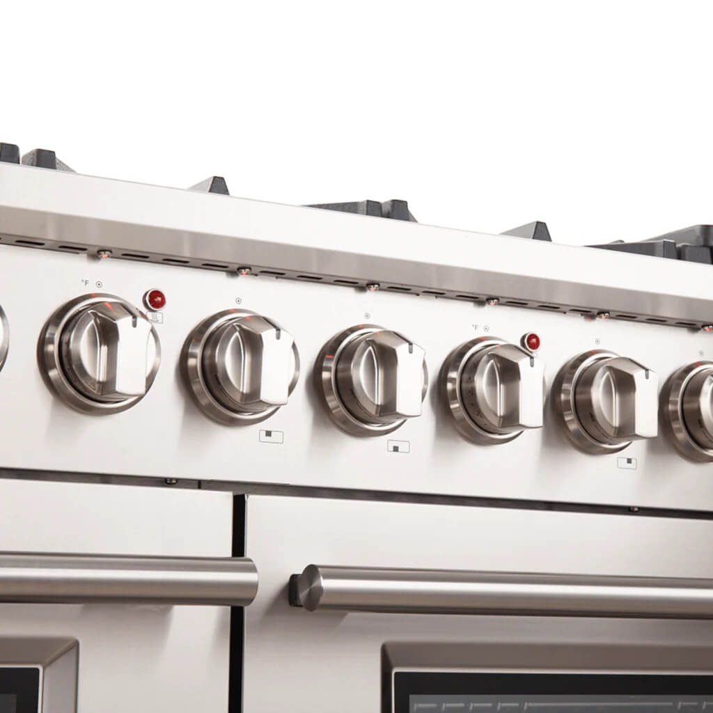 The FORNO Capriasca 48″ Gas Range brings professional-grade performance and elegance to your kitchen. Constructed with 304-grade stainless steel, this range features 8 dual-ring brass burners with a total output of 160,000 BTU, ensuring versatility for both high-heat searing and gentle simmering.