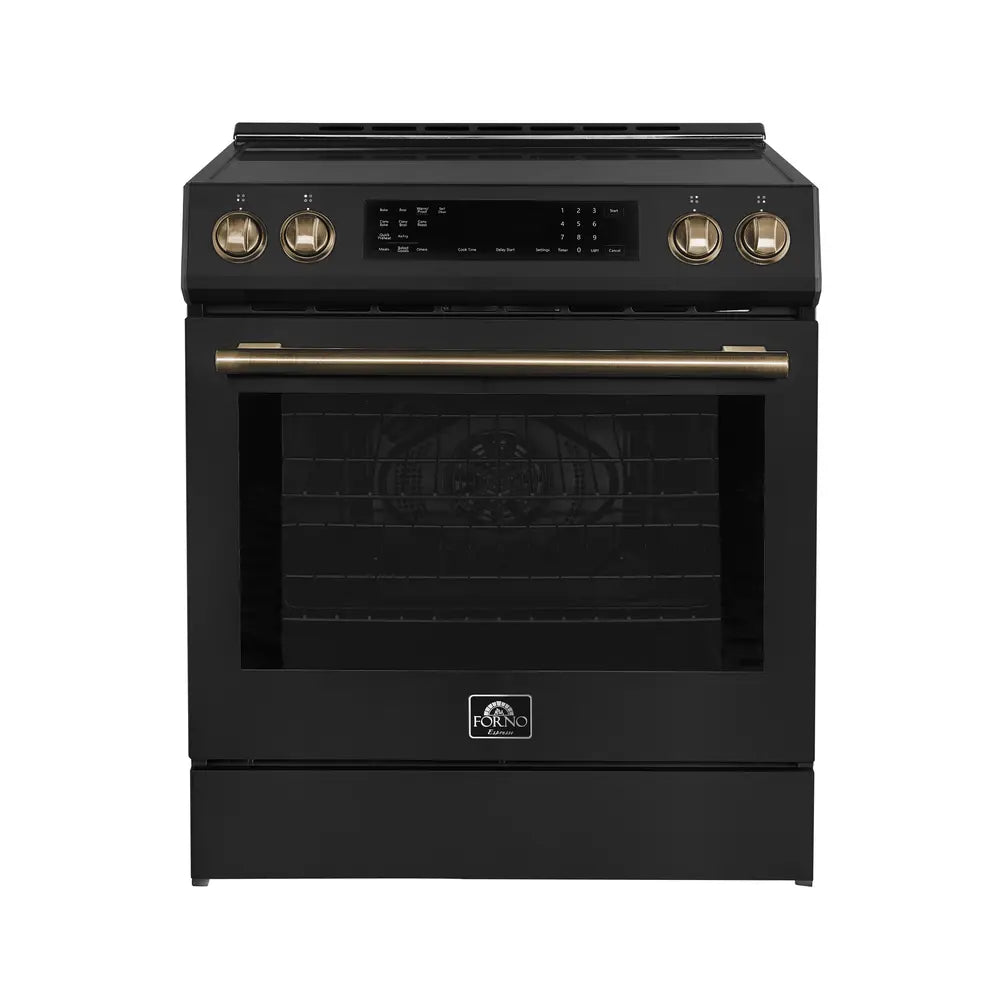 The Forno Donatello 30-Inch Slide-In Induction Range is an exceptional blend of style, power, and innovation designed to elevate your kitchen experience. Featuring induction cooking technology, a spacious 5.0 cu. ft. convection oven, and multiple cooking functions, this range delivers fast and precise performance for both everyday meals and gourmet dishes. Its customizable design allows you to switch between antique brass and stainless steel handles and knobs, giving you the freedom to match your preferred kitchen aesthetic.