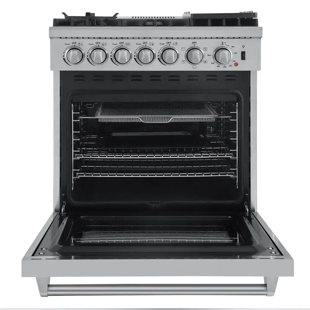 The Forno 30” Freestanding Dual Fuel Range combines professional performance with premium aesthetics, designed to elevate your home kitchen. Constructed with durable 430-grade stainless steel, this range is built for both style and longevity.