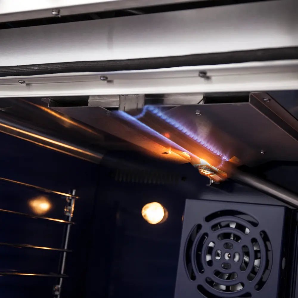 - Spacious 4.32 cu.ft. convection fan oven with 30,000 BTU for broiling and baking