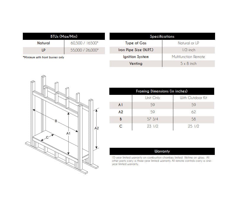 BTU (Max / Min) NG: 60,500 / 16,500 – LP: 55,000 / 26,000