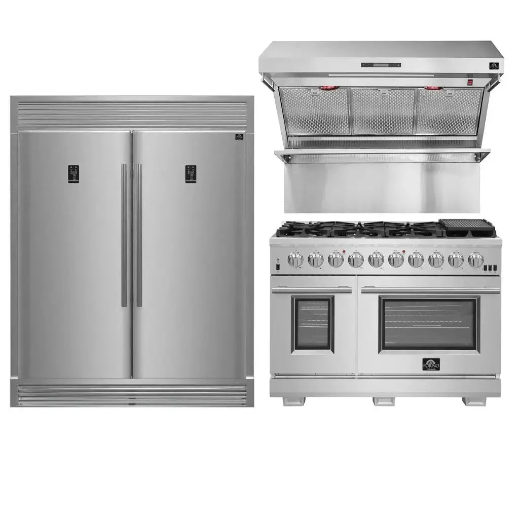 Elevate your kitchen with the FORNO Premium 3-Piece Kitchen Bundle, a perfect blend of professional-grade performance, stunning design, and exceptional functionality. This exclusive package includes the Capriasca 48" Freestanding Gas Range, the Rizzuto 60" Dual Combo Convertible Refrigerator, and the 48" Wall Mount Range Hood, delivering everything you need to upgrade your culinary experience.