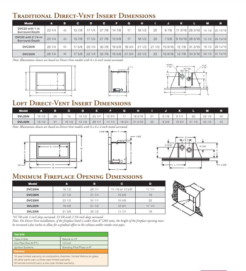| Min. Fireplace Opening | 23 1/2" H x 34 1/4" W x 16 5/8" D |
