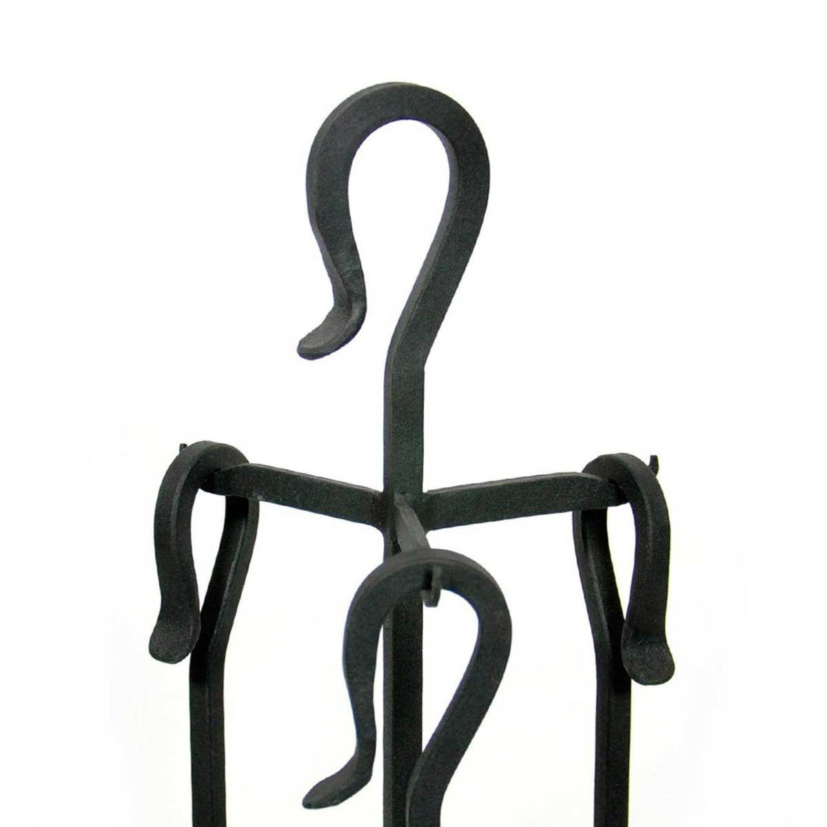 Our mini fireplace tool sets are perfect for those with a woodstove or small fireplace. The simple design features a loop handle for easy carrying and a sturdy three-prong leg base for stability. Constructed from heavy-duty wrought iron and finished with a durable black powdercoat, these tools provide long-lasting functionality and a classic look. The set includes a shovel, poker, and ash hoe, each with loop handles that conveniently hang from the stand. Measuring 26 inches high, this compact tool set is both practical and stylish for smaller hearths.